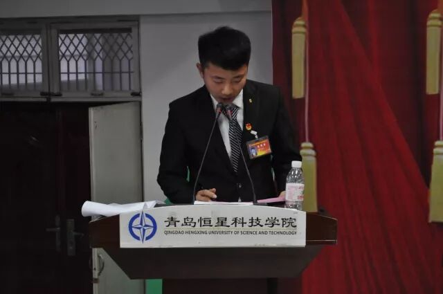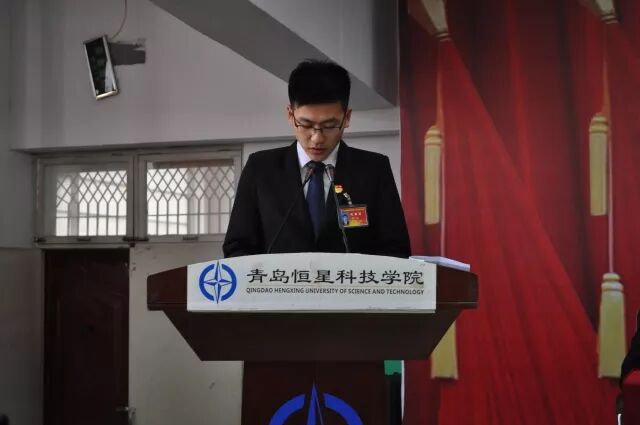 第十七届学生委员会秘书长高杰宣读《青岛恒星科技学院第一次学生代表大会倡议书》