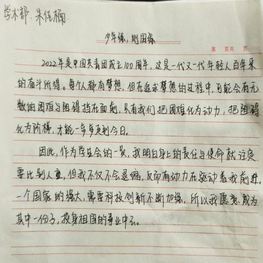 2022年是我们共产主义青年团建团100周年,作为一名青年,我一直在为自己的梦想而奋斗。作为一个中国人,我更坚信,我的梦想应该与祖国的梦想结合起来,以国家为主个人为辅,唱响青春之歌。