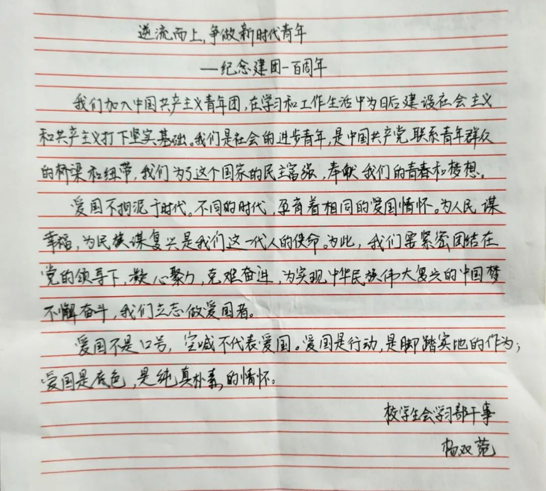 “青春就因为未知,所以才充满惊喜。”人民把希望寄予青年,百年前是如此,百年后亦是如此,“请指给我们你走的路,让我们走下去”身为共青团员的我们,应该,也必须继承先辈的精神,深知百年历程的艰辛不易。在漫漫历史的征途中,总有一群群新青年在各个领域发光发热,为祖国的强大复兴默默贡献力量。