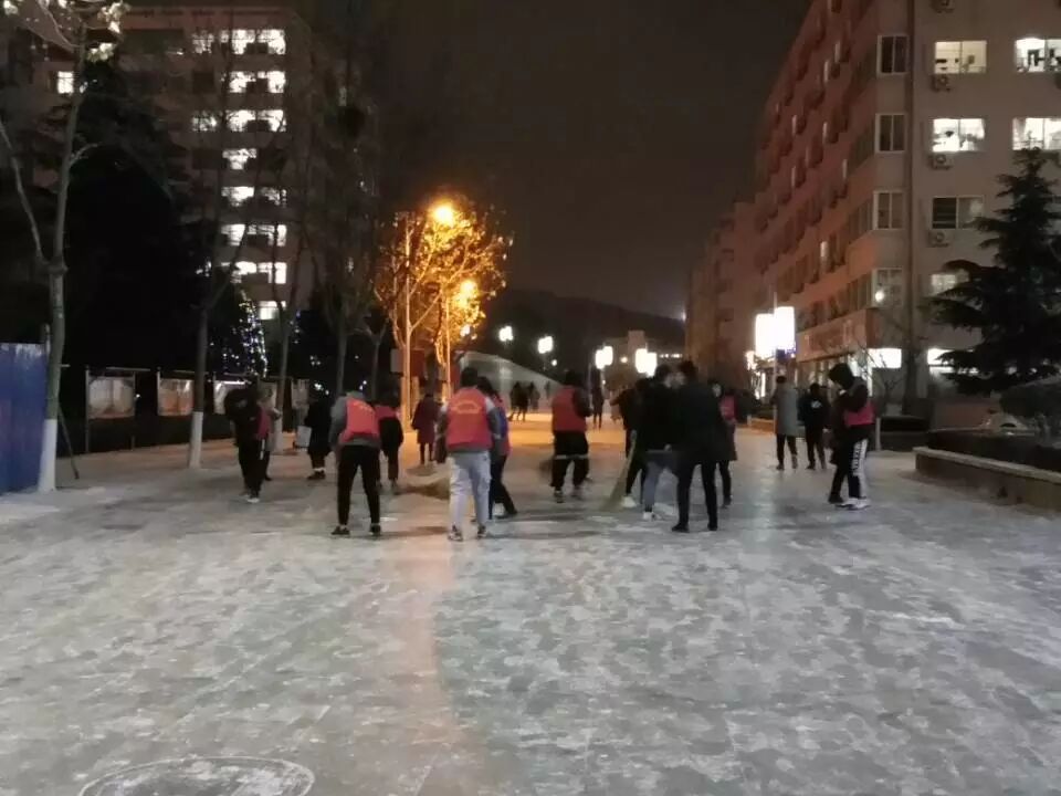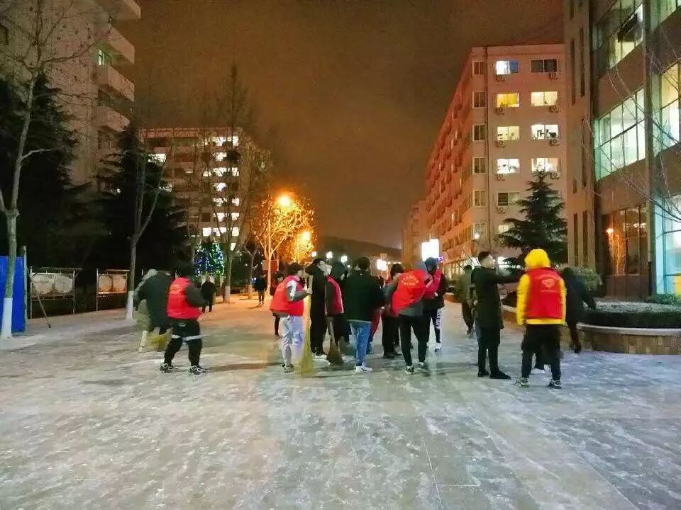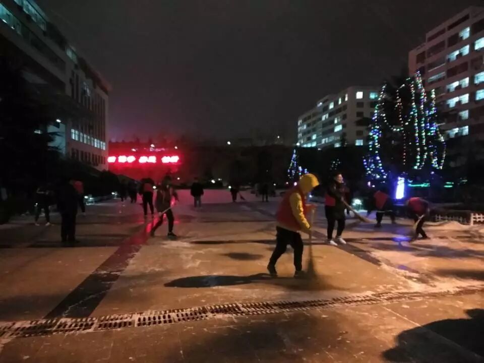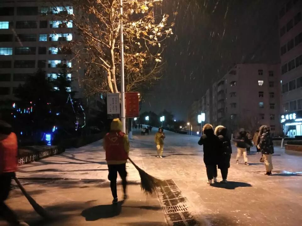 一场雪飘然而止,给冬日的校园裹上了银装,分外的美丽。在装点大地的同时,也有了一层厚厚的积雪。团团走在路上,都能听到咯吱咯吱的响声。即使在这寒冷的夜晚,仍然有一群人在人们必经的道路上忙碌着,这些志愿者在下雪的冬天,给空气渲染了一丝温馨,给每个经过的人送去了属于他们的温暖。