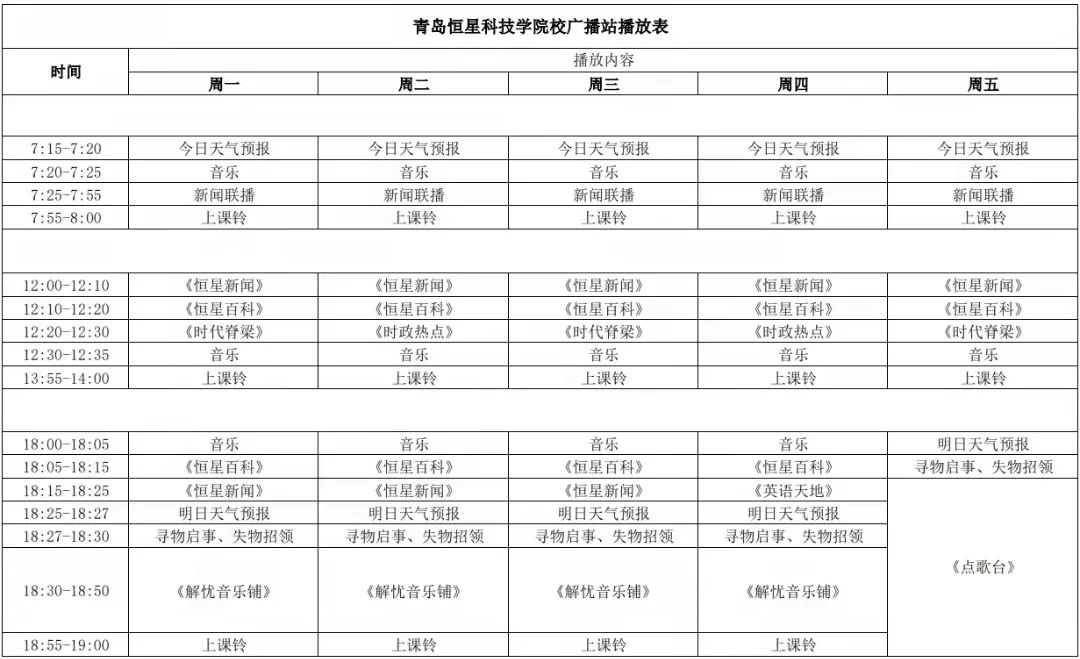 青岛恒星科技学院校园广播包括《新闻联播》、《恒星新闻》、《恒星百科》、《时代脊梁》、《时政热点》、《解忧音乐铺》等15档栏目,旨在加强学生与学校的联系,宣传“成就他人,幸福你我”的恒星核心思想理念,弘扬“同心同德,自信自强”的恒星核心精神,使学生了解校园文化,培养国际视野,同时营造轻松愉快,积极向上的校园氛围。
