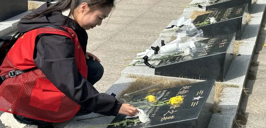 仪式结束后,志愿者了解了革命先烈的英雄事迹并向烈士英雄献花默哀,表达对为国捐躯的革命先烈们的敬仰和哀思。